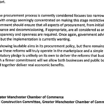 Cusack said: "The construction industry in our region was severely impacted by the recession and is still finding conditions incredibly tough. Our members are consistent in their observations that the procurement processes are slow and bureaucratic, and as a Chamber of Commerce, we feel that these issues are not exclusive to our region. Our Property and Construction Committee represents the views of over 600 businesses across Greater Manchester and we believe that unless changes are made to the current system, the construction sector's recovery from recession will be hampered, and the broader economy will also suffer."