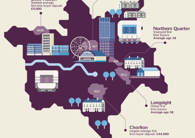First time buyers who choose to live in Chorlton (M20), Didsbury (M21) and Sale (M33) put down the largest deposits and pay an average of £157,000 for a property. This is 34% more than the price paid by the average first time buyer in Manchester.