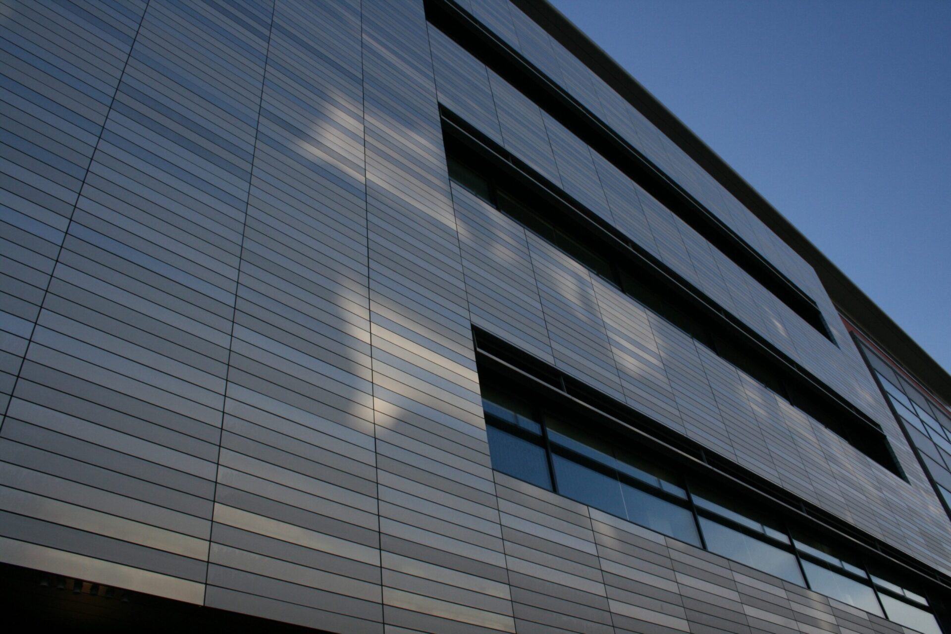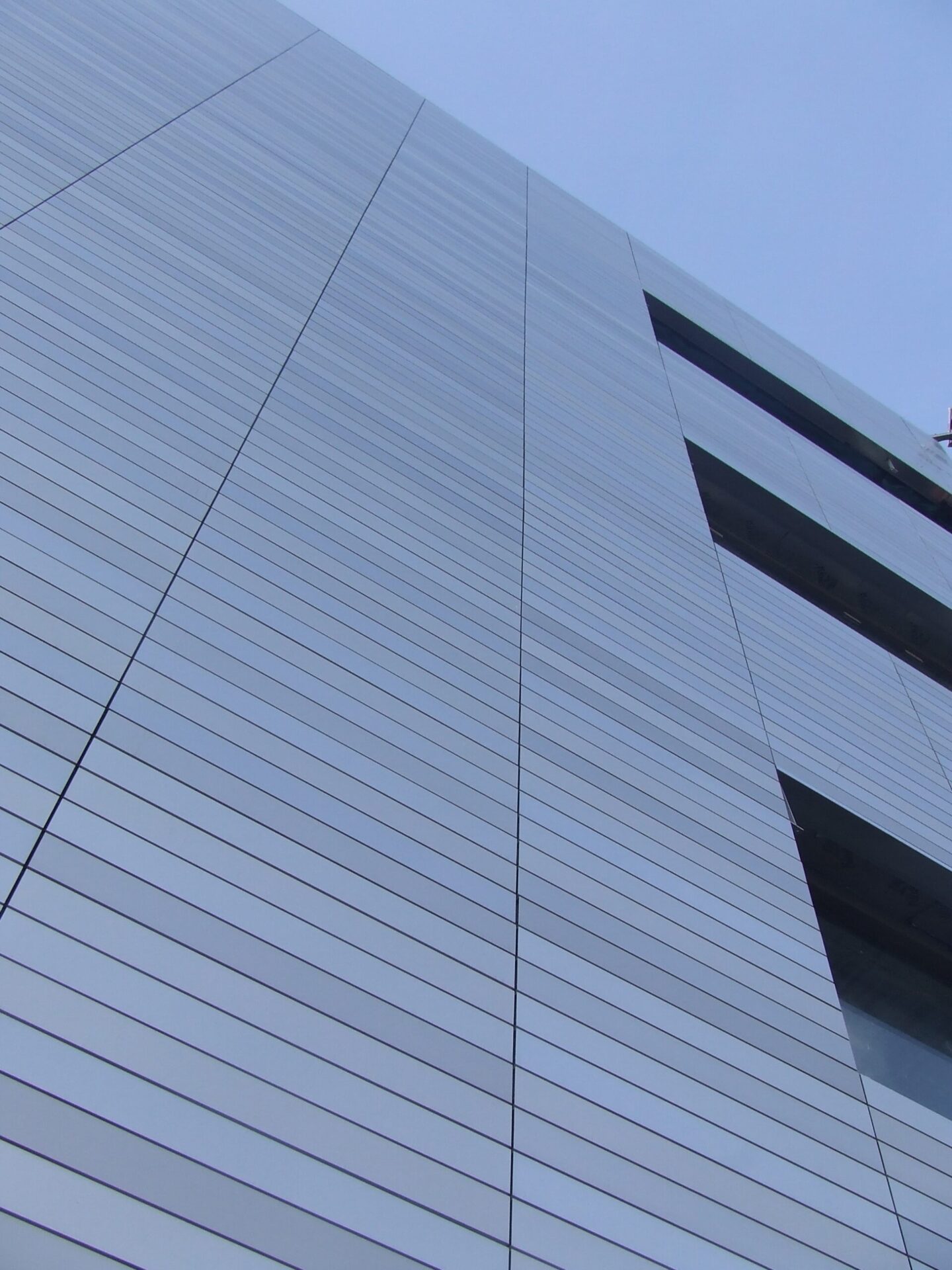 The finish to the Michael Smith Building uses four anodised finishes on a range of mirror-polished and highly etched Senses aluminium tiles. A 'random' pattern was devised to ensure the different finishes were distributed across the elevation to give a cohesive façade.