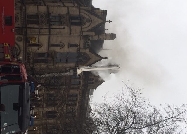 Earlier in the day smoke was visible emerging from the top floors and side of the building, which is next to Manchester Town Hall.