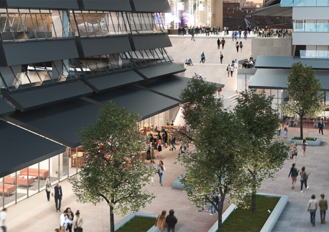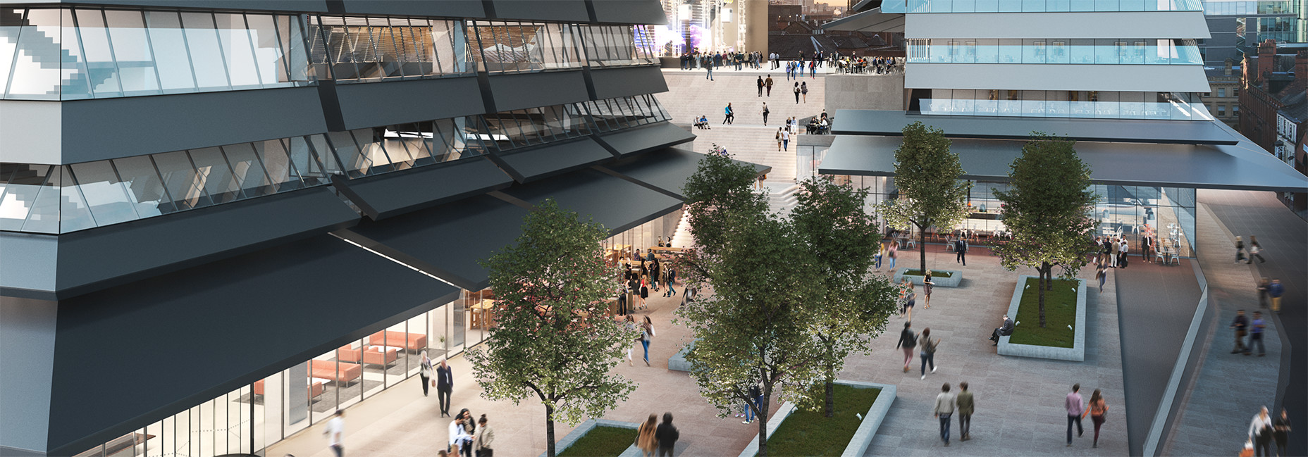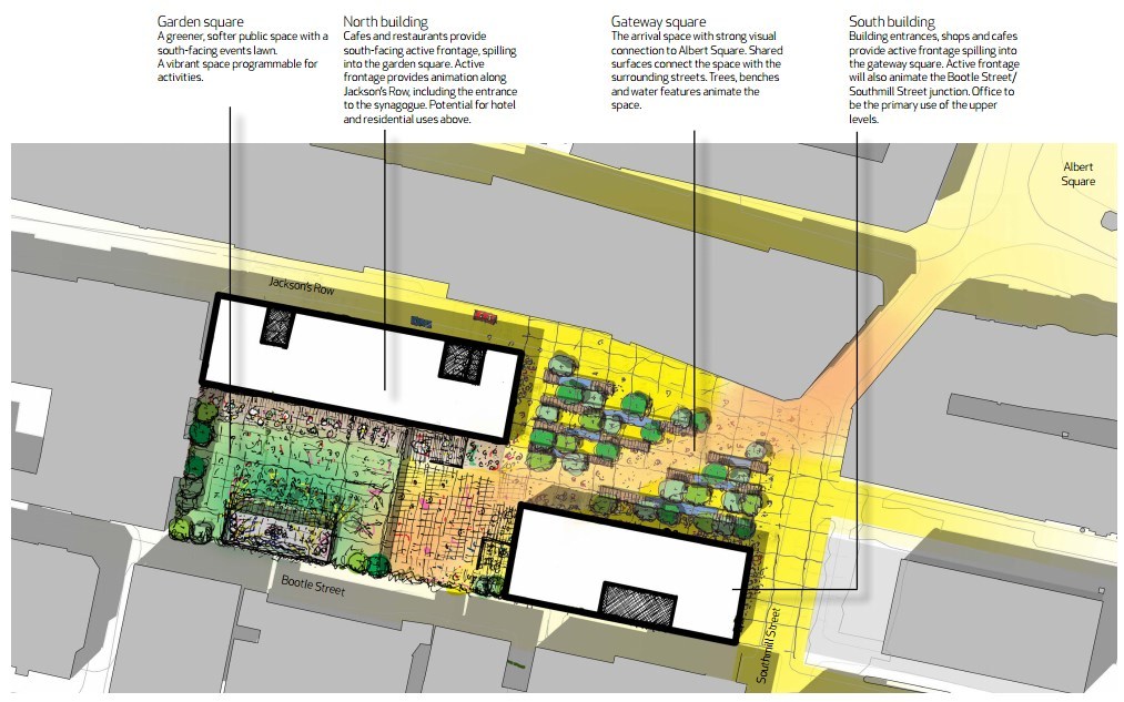 While the development team have remained tight-lipped about the future of the properties on the site, indicative images show the current buildings replaced by two large blocks, sitting either side of a public realm route cutting through St Michael’s from Bootle Street to the corner of Albert Square. Part of the public realm would be built on the roof of the new synagogue and accessed by steps.