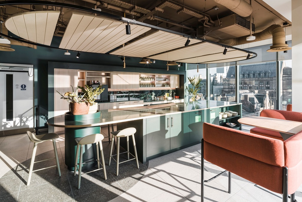 These social hubs have sinks and a flex seating offer with the main hub on the eighth floor also boasting a chilled cook-it-yourself vending machine as well as bean-to-cup coffee.