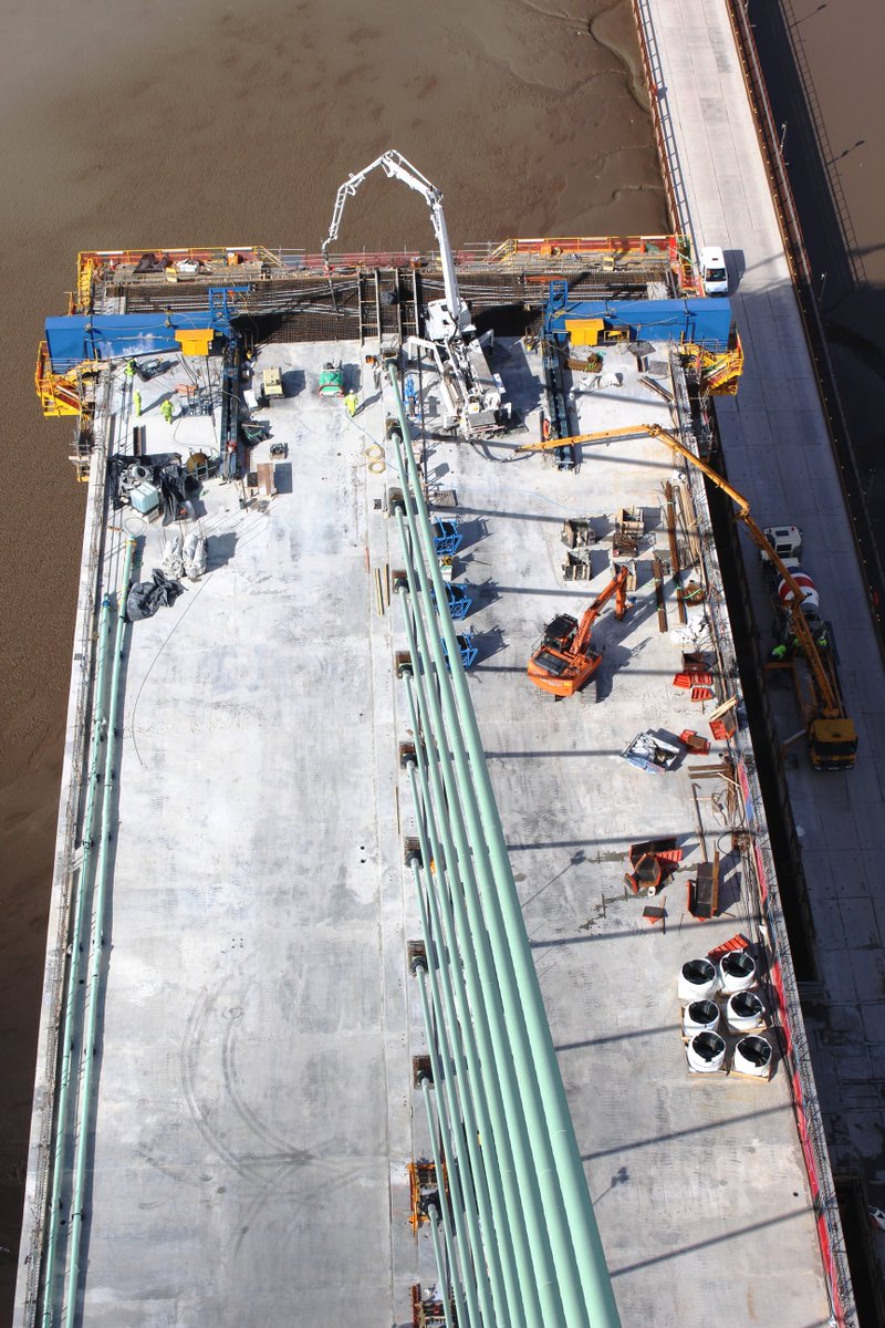 - Concrete pour of the bridge deck at the central pylon, shown at 45% complete, with 100 metres constructed and 122 metres to go