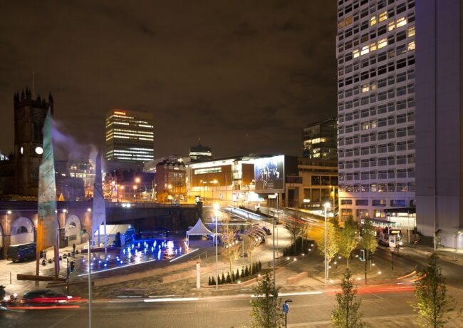 The new square designed by Whitelaw Turkington and Arup is designed to host concerts and markets and is linked to Manchester's Deansgate by a new bridge. There are 36 coloured fountains which can be programmed to suit different activities in the square.