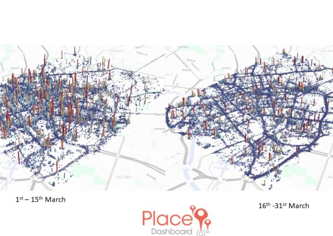 PlaceDashboard is able to measure social distancing by tracking GPS location data captured from mobile phones. The analyst, part of the Mi-IDEA start-up cohort at MSP, is able to track precise movement patters across an entire city centre and identify where the volume of movement activity has changed when two periods of time are compared against each other.