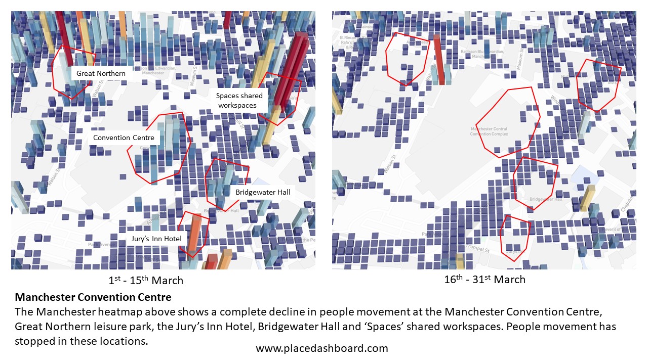 The amount of people visiting Manchester city centre fell by 70% from the first two weeks of March to the second two weeks after restrictions on movement were brought in, according to a series of heatmaps produced by Place Dashboard, a shopper behaviour analyst based at Manchester Science Park.