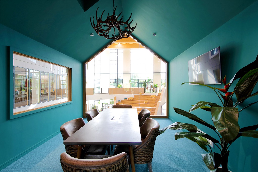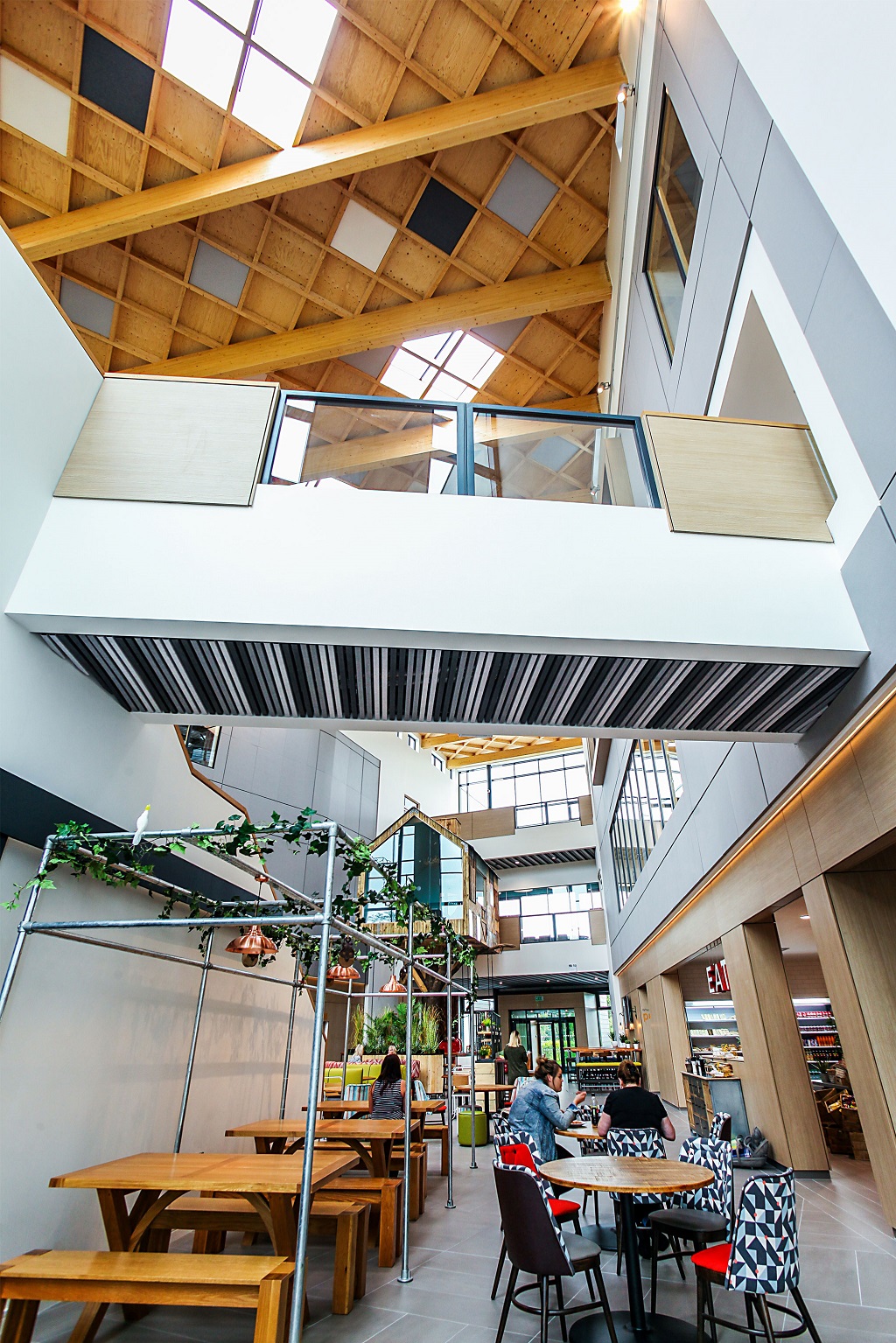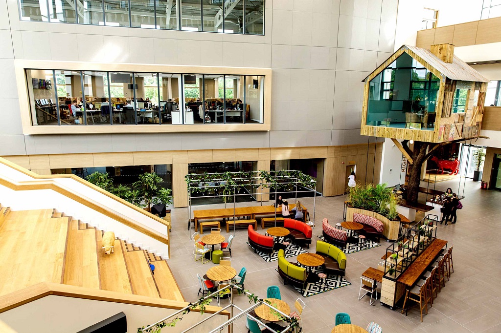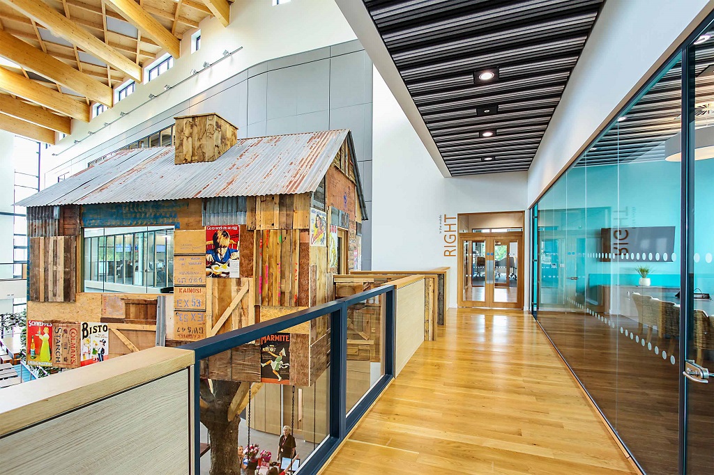 The project was designed as two three-storey wings flanking a 17m-high central atrium. A priority was to ensure that staff on every floor felt connected to the central space, which achieved through the use of large picture windows looking directly in from the offices, and bridge links crossing at high level. The atrium includes a treehouse meeting room, indoor terrace and stadium seating.