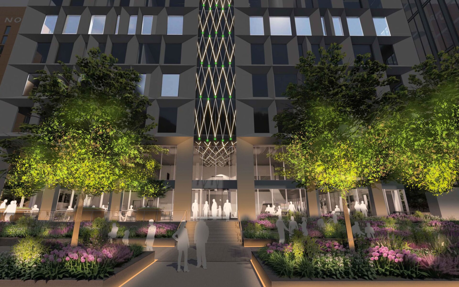 A new CGI showcases the lighting design by Artin, as well as the green space around the building. Artin recently worked alongside SpaceInvader Design and Lazerian to redesign the pavilion at Piccadilly Gardens in Manchester.