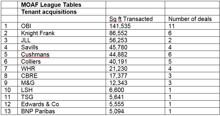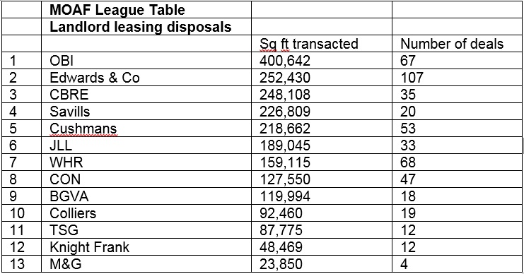 Figures compiled by the Manchester Office Agents Forum showed OBI Property topping the table for landlord disposals, followed by Edwards & Co and CBRE. Edwards & Co was top by number of deals for landlords, with WHR second and OBI third.