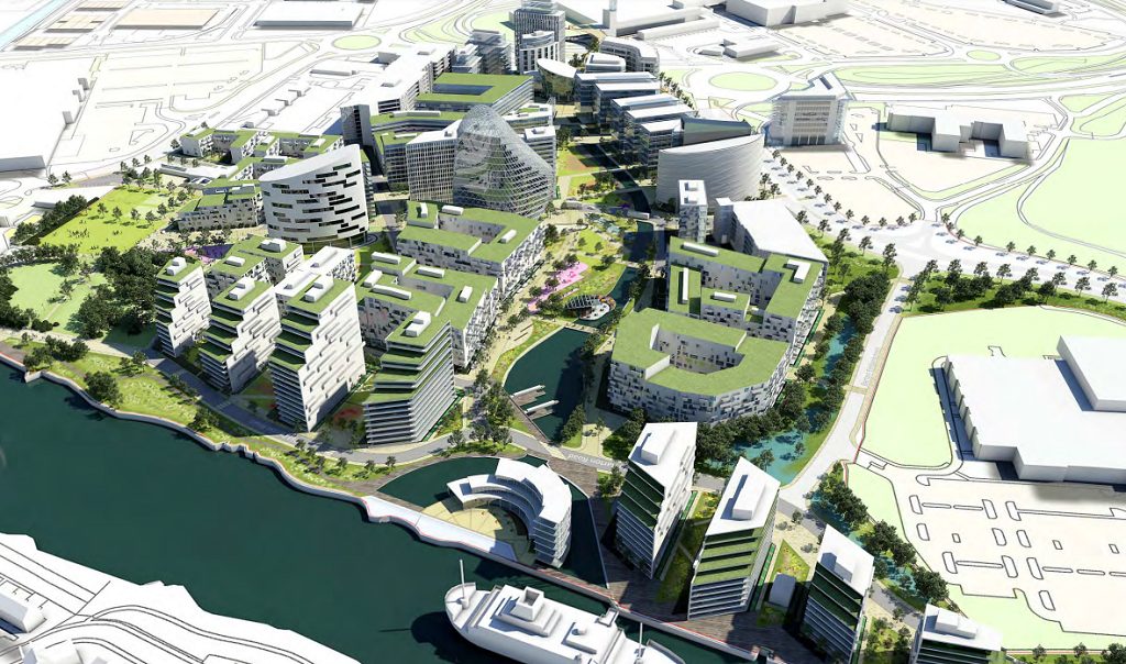 As well as 3,000 homes and almost 1m sq ft of commercial space – including 860,000 sq ft of offices – outline plans for Peel’s Trafford Waters include a 300-bedroom hotel, 150-bedroom care home, a primary school and a pedestrian footbridge over Trafford Boulevard.