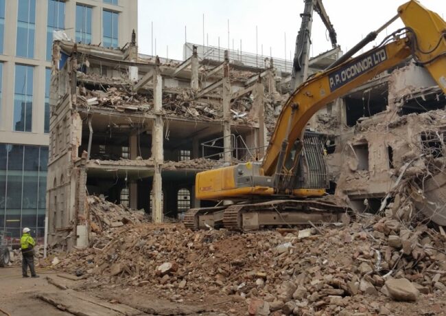 With a project value to PP O’Connor around £600,000 the scope of operation included the removal of all remaining loose furniture; soft strip of internal features; and building separation from the remaining development within the block ahead of the hard demolition activities.