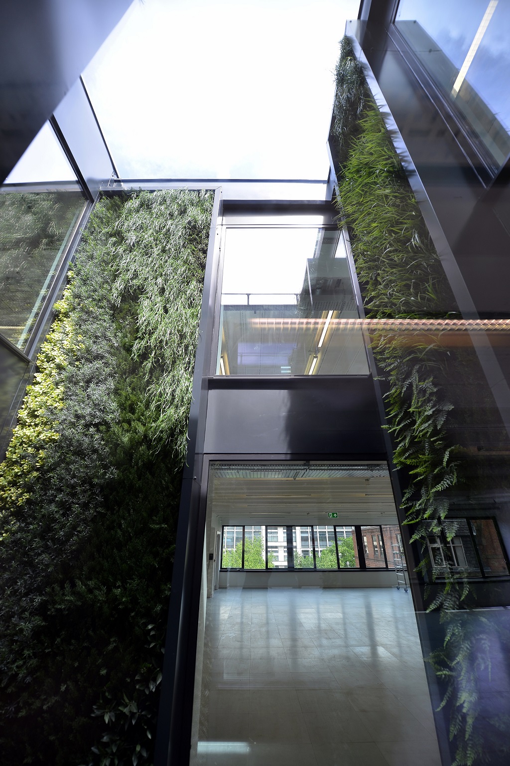 The refurbishment includes a new entrance and communal areas, and a fit-out of the offices to expose the mechanical and electrical services and a central light well with feature green walls.