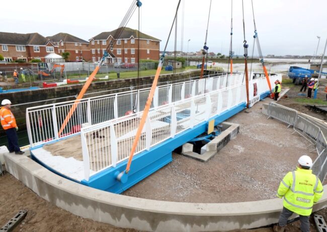 Redrow has installed a £1m swing bridge to connect its Harbour Village development in Fleetwood to the centre of the town.