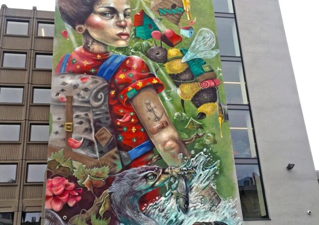 The original artwork has been created by the Nomad Clan. It took the all-female street art group two weeks to complete the mural, which covers the side of the office.