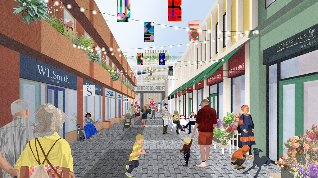The project aims to reinstate the historic street, hidden beneath Stretford Mall, as a lively retail and leisure boulevard, and to establish a new market hall, with independent market retail traders, as well as places to eat and drink.