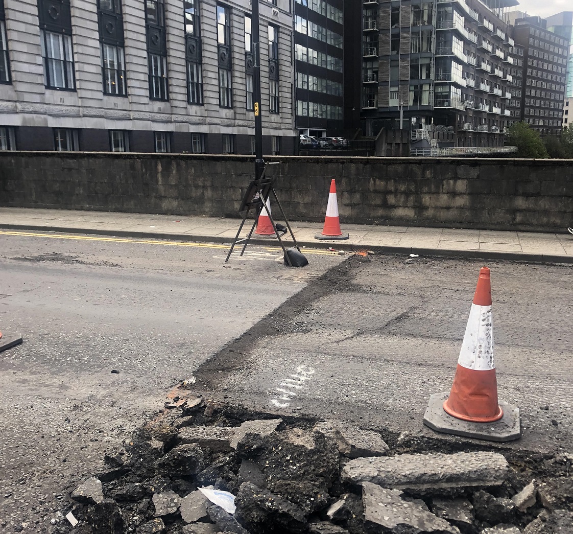 COUNTY LINES…So much for a joined-up highways and transport system in Greater Manchester. Here is the state of play on Blackfriars Bridge, half of which belongs to Salford City Council and the other half to Manchester City Council. Salford is cracking on with making the one-way system and cycle lane implemented during the pandemic permanent but Manchester clearly didn’t get the memo to make a start on their half of the street…